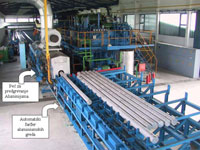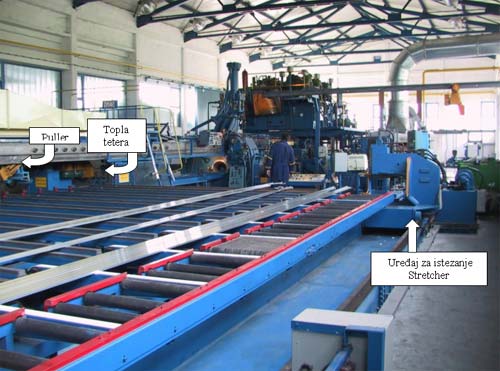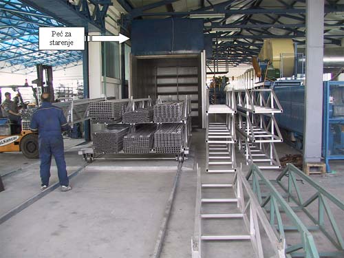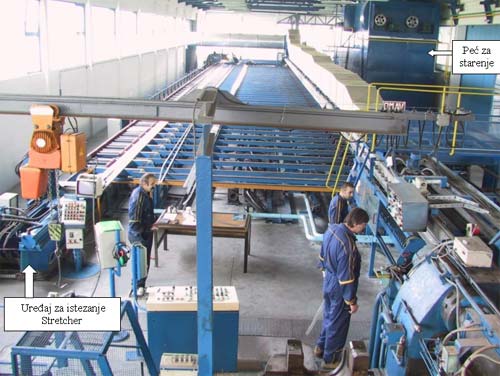 After extrusion, the profile is being cut on the so-called Warm Saw and automatically transferred across working bench to a strecher. After streching, profile is being cut to final length of 6 meters. These profiles are then taken to Artificial Aging Owen where they are heated to 180 °C for period of 8 hours.