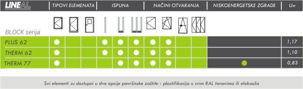 Sistem LINEAL BLOCK THERM 62 je jedan od jedanaest iz serije LINEAL i predstavlja sistem aluminijumskih profila sa termičkim prekidom i skrivenim krilom, specijalno projektovanih za izradu prozora sa ugradnom dubinom štoka od 62mm. Sistem je dizajniran tako da zadovoljava savremene zahteve na polju energetske efikasnosti, kao i ostale uslove nepohodne za bezbedan i udoban radni i životni prostor. Prilikom projektovanja elemenata sistema posebna pažnja je posvećena odabiru materijala koji vrše funkciju termičkog prekida u sklopu sistemskih profila i dodate su posebne sunđeraste ispune unutar komora profila. Na ovaj način postignute su maksimalne termoizolacione karakteristike Uf≈2,00W/m²K, odnosno Uw≈1,10/m²K.